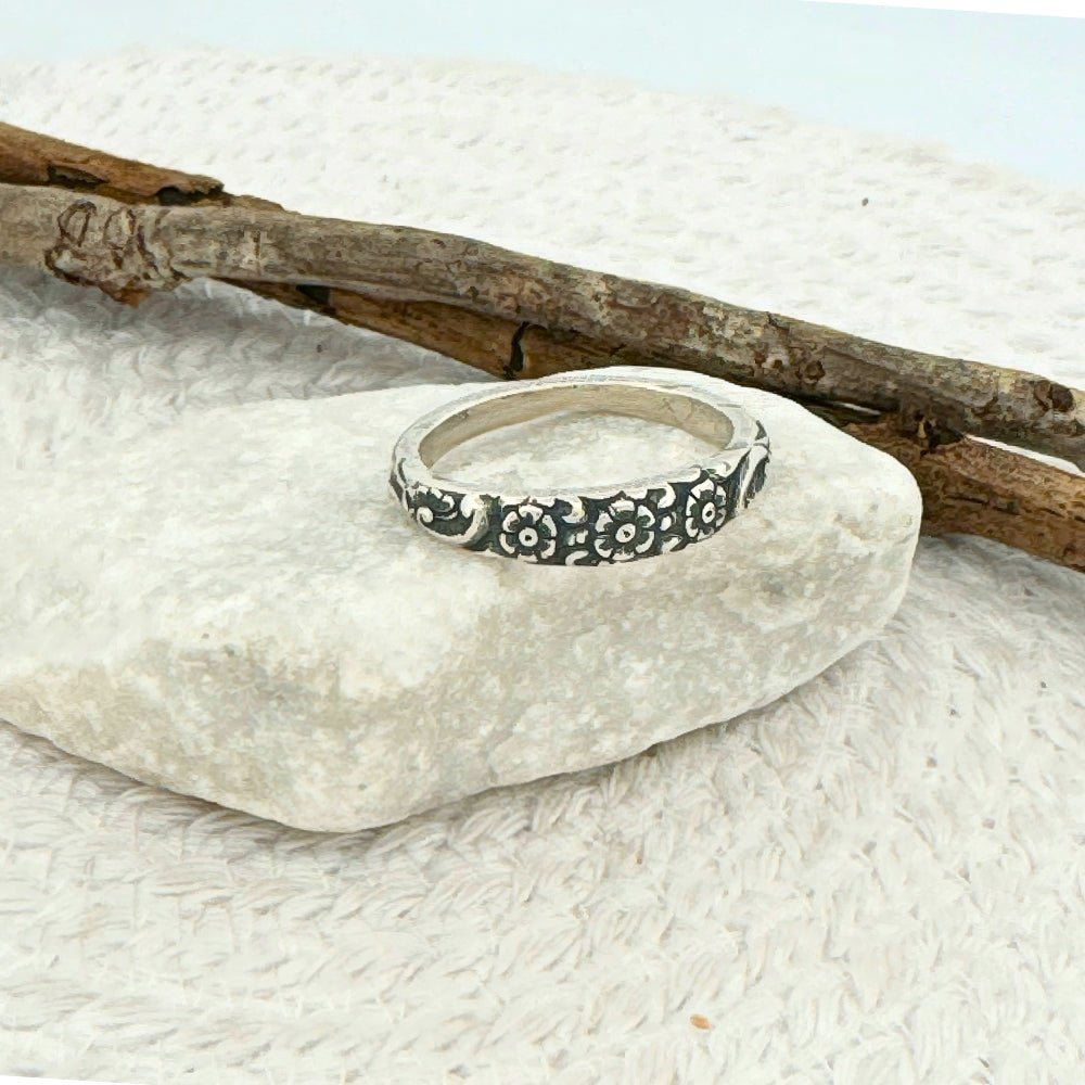 The Petite Flower Silver Band Ring celebrates simple beauty and nature’s elegance. Delicate yet meaningful, this handmade ring features three tiny flowers with subtle scroll details, creating a soft, organic design that feels whimsical and timeless. Whether worn alone or stacked with other bands, this ring is a graceful reminder of nature’s quiet charm.